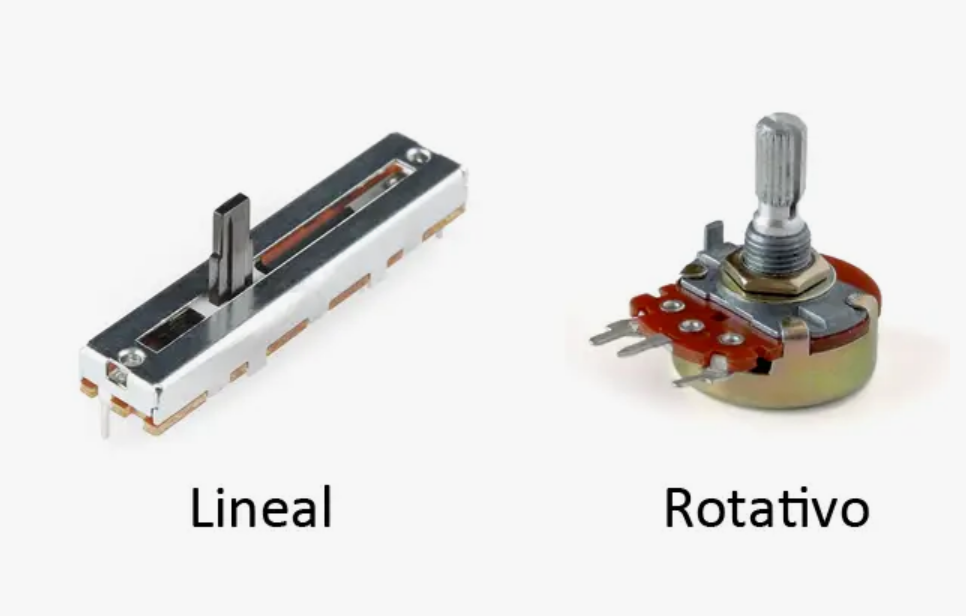 Ajusta la resistencia girando un eje. Es el más común en aplicaciones manuales como controles de volumen. Trimmer (ajustable): Diseñado para ajustes finos y menos frecuentes. Se ajusta con un destornillador. Lineal: Ajusta la resistencia moviendo el cursor a lo largo de una pista recta. Digital: Controlado electrónicamente mediante señales digitales, eliminando ajustes manuales. |