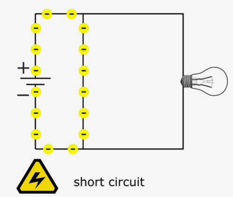 Si por el contrario unimos el positivo y el negativo con un cable, la corriente ya no pasara por la lampara. Se ira del polo negativo de la batería al polo positivo, y esto provocará un corto circuito.