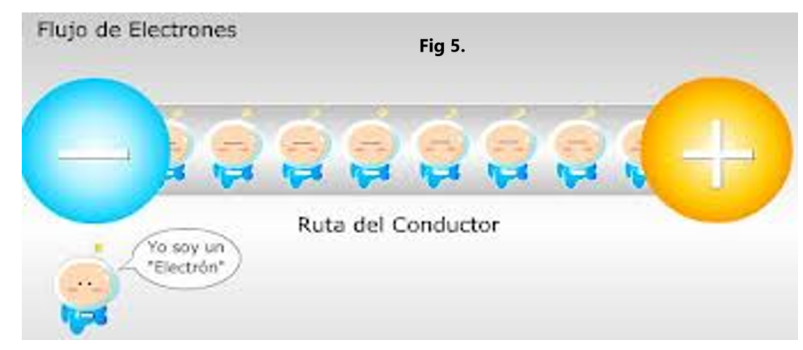 Nota: En muchos textos de electrónica básica, se sigue usando la corriente convencional de positivo a negativo, a pesar de que a nivel subatómico los electrones se mueven en sentido opuesto. Esto no afecta el análisis de circuitos, pero es importante conocer la diferencia. Fig 5.
