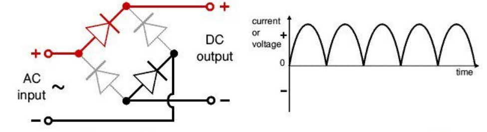 Durante el medio ciclo positivo de la señal de entrada: Dos diodos conducen (D1 y D3 en un puente típico). Los otros dos diodos están en polarización inversa (no conducen). La corriente fluye hacia la carga en una dirección. Ciclo negativo de la corriente alterna: Durante el medio ciclo negativo: Los otros dos diodos conducen (D2 y D4). La corriente fluye en la misma dirección hacia la carga, gracias a la configuración del puente Resultado: En ambos ciclos (positivo y negativo), la corriente en la carga siempre fluye en la misma dirección, convirtiendo la entrada AC en una señal DC pulsante.